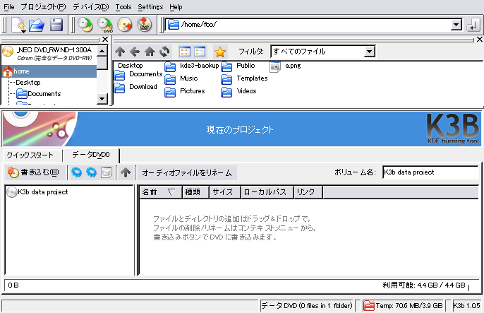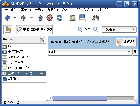 GNOME デスクトップではファイルマネージャである nautilus を使用して DVD-R/CD-R を作成する方法について説明します。以下新たにツリーを作成する場合と ISO イメージがすでにある場合(ブートCDの作成のような場合)に分けて説明します。いずれの場合も空のメディアをドライブにいれておき、デスクトップに「空の CD-R ディスク」アイコンがあるか、あるいはファイルブラウサ上に「空の CD-R ディスク」ができていることを確認してください。
