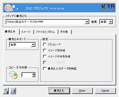 この他には、書込みの終了と同時にメディアを排出する -eject オプションなどがよく使われます。wodim についてより詳しくは man wodim を参照してください。