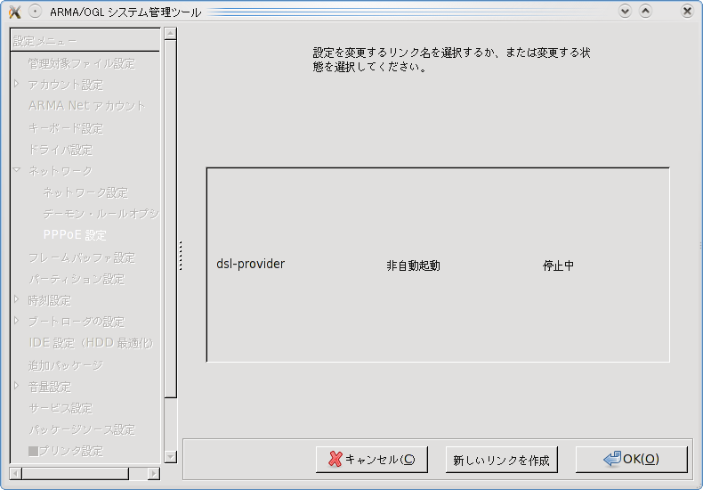管理ツールでは起動時の設定も可能ですが、ここで例えば dsl-provider という名前でリンクを作成した場合、
