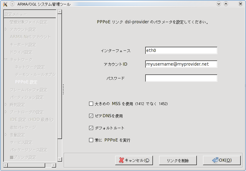 管理ツールでは「ネットワーク」-「PPPoE設定」で PPPoE の設定をおこなうことができます。