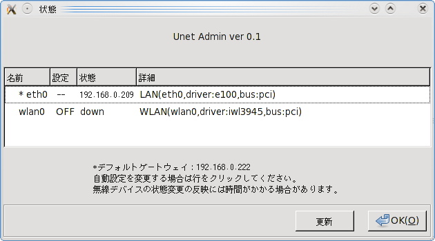 この例では、宛先が自分のネットワーク 192.168.0.0/24 ならば eth0 から直接送信し、それ以外は cosmos に eth0 からパケットを送る設定になっています。つまり、cosmos がデフォルトゲートウェイです。