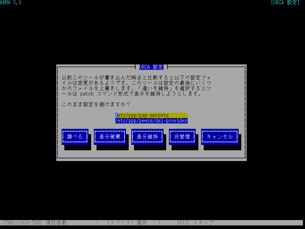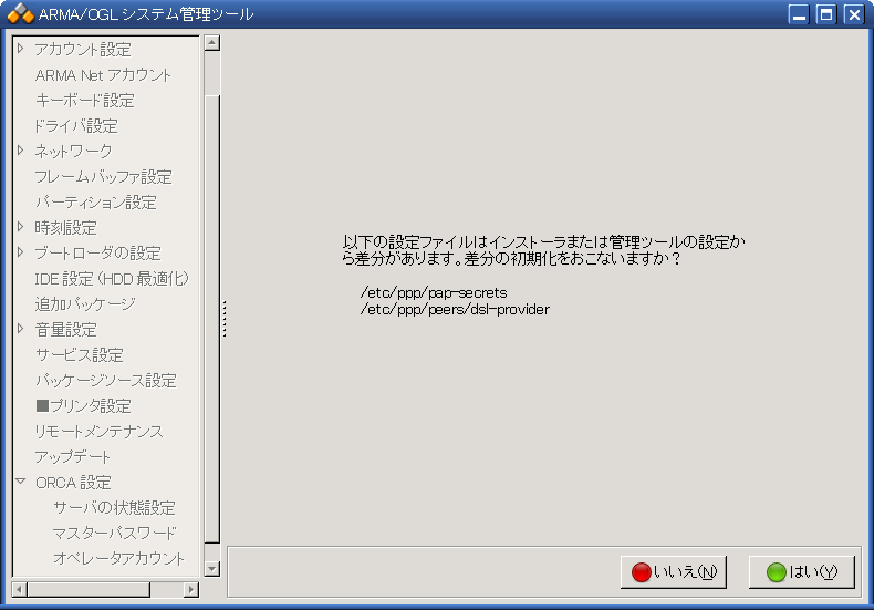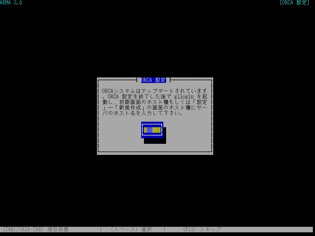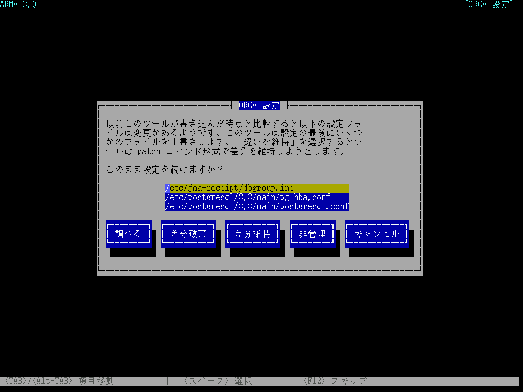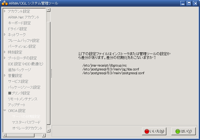 ogl-admin を起動し「ORCA 設定」を選択します。設定ファイルの想定との違いに対して修正をおこなうかどうか尋ねられた場合は「差分破棄」を選択してください。おおむね以下の質問が表示されます。