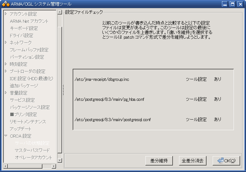ogl-admin を起動し 「ORCA 設定」から「サーバの状態設定」を選択します。設定ファイルの想定との違いに対して修正をおこなうかどうか尋ねられた場合は「全差分破棄」もしくは「はい」を選択してください。おおむね以下の質問が表示されます。