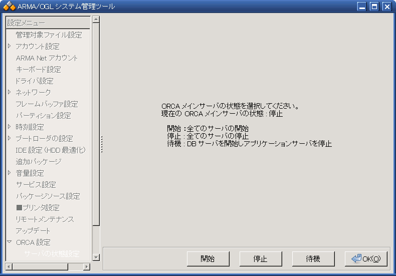 ogl-admin を起動し、ORCA サーバを起動します。「ORCA設定」→「サーバの状態設定」→「開始」を選択しください。以上で ORCA サーバのアップデートが完了です。