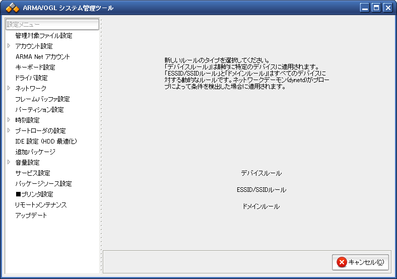 ルールの選択画面では「デバイスルール」または「ESSID/SSIDルール」を選択します。「デバイスルール」は特定のデバイスに対して設定をおこない、「ESSID/SSIDルール」は無線のスキャンにより ESSID/SSID を発見した場合に設定をおこなうルールです。