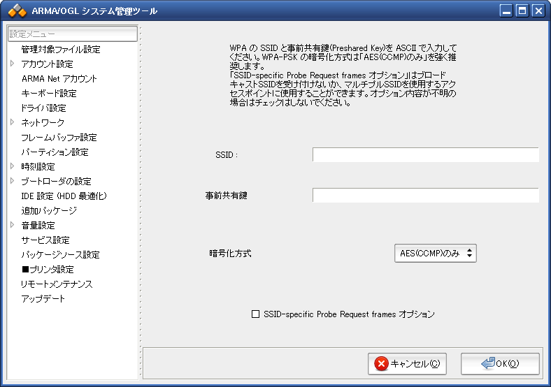ARMA ホストを接続するにあたってアクセスポイント側に特別に必要となる設定はありません。無線 LAN デバイスが着脱可能な場合は、管理ツールを起動する前にデバイスを接続してください。以下では一般的な WPA/WPA2+AES 例にとって説明をおこないますが、他の接続方式についても同様に設定することができます。