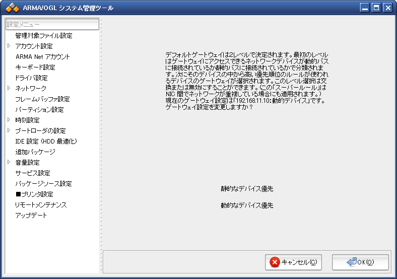 デフォルトゲートウェイの決め方を選択します。有線 LAN と無線 WLAN が同時に有効になっている場合に、無線 LAN を優先させる場合は「動的なデバイス優先」を選択し、有線 LAN を優先させる場合は「静的なデバイス優先」を選択してください。
