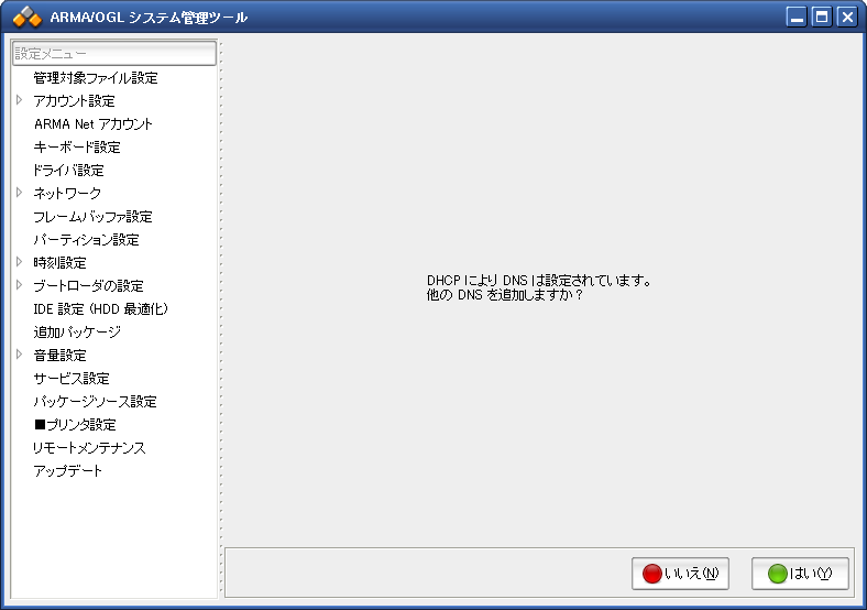 DNS の設定をおこないます。すでに設定されている DNS の他の DNS を追加する場合は「はい」を、そうでない場合は「いいえ」を選択してください。