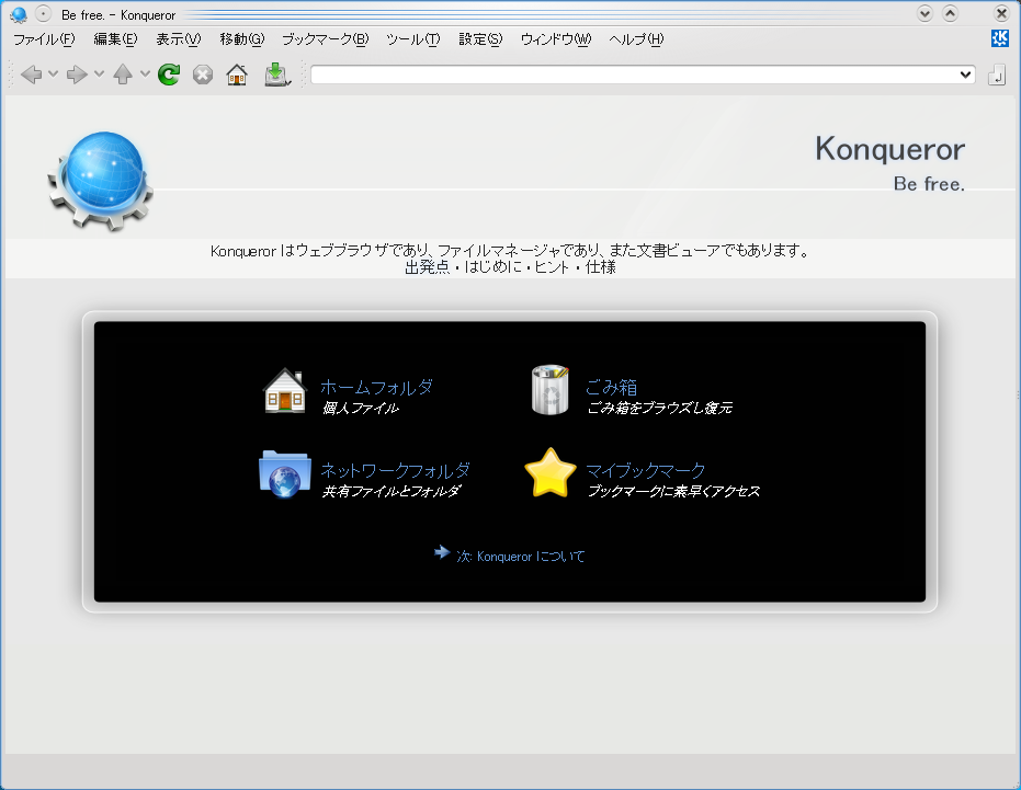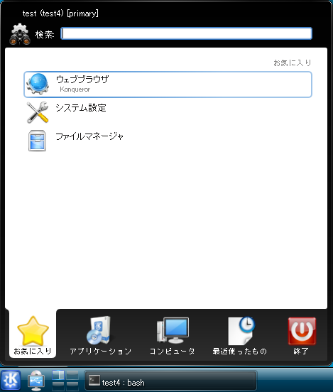 Konqueror を起動する場合も同様で KDE でメニューから「お気に入り」-「ウェブブラウザ」をクリックするか、以下のようにコマンドを実行します。